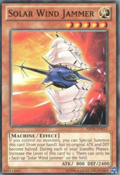 If you control no monsters, you can Special Summon this card (from your hand), but its original ATK and DEF become halved. During each of your Standby Phases: Increase the Level of this card by 1. There can only be 1 ‘Solar Wind Jammer’ on the field.