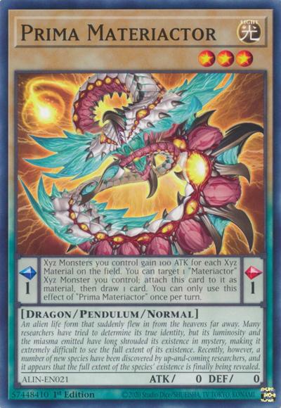 [ Pendulum Effect ] Xyz Monsters you control gain 100 ATK for each material attached to monsters on the field. You can target 1 ‘Materiactor’ Xyz Monster you control; attach this card to it as material, then draw 1 card. You can only use this effect of ‘Prima Materiactor’ once per turn.[ Monster Effect ] ”An alien lifeform that suddenly crash-landed from the heavens far above. Although many researchers have tried to determine why it came, the combination of its luminous glow and the miasma that surrounds it have long shrouded its existence in complete mystery. As a result, trying to grasp the whole picture has been extremely difficult. However, in recent years, thanks to the efforts of up-and-coming researchers, many new species have been discovered. The day will soon come when the full extent of their existence will be revealed.”