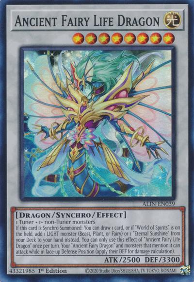 If this card is Synchro Summoned: You can draw 1 card, or if ‘World of Spirits’ is on the field, add 1 LIGHT monster (Beast, Plant, or Fairy) or 1 ‘Eternal Sunshine’ from your Deck to your hand instead. You can only use this effect of ‘Ancient Fairy Life Dragon’ once per turn. Your ‘Ancient Fairy Dragon’ and monsters that mention it can attack while in face-up Defense Position (apply their DEF for damage calculation).