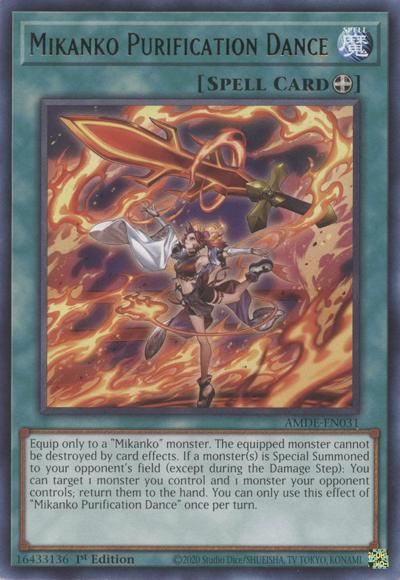 Equip only to a ‘Mikanko’ monster. The equipped monster cannot be destroyed by card effects. If a monster(s) is Special Summoned to your opponent’s field (except during the Damage Step): You can target 1 monster you control and 1 monster your opponent controls; return them to the hand. You can only use this effect of ‘Mikanko Purification Dance’ once per turn.