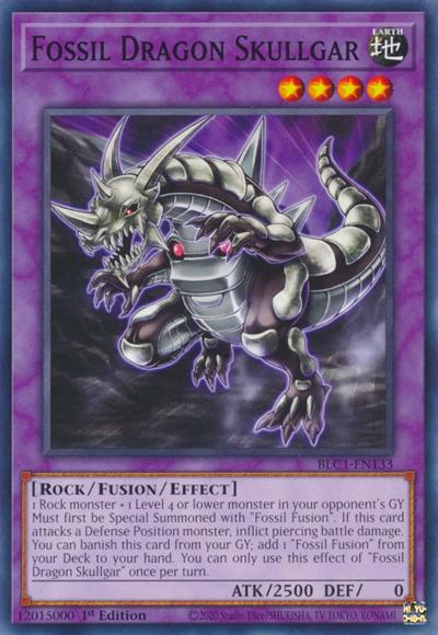 1 Rock monster + 1 Level 4 or lower monster in your opponent’s GYMust first be Special Summoned with ‘Fossil Fusion’. If this card attacks a Defense Position monster, inflict piercing battle damage. You can banish this card from your GY; add 1 ‘Fossil Fusion’ from your Deck to your hand. You can only use this effect of ‘Fossil Dragon Skullgar’ once per turn.