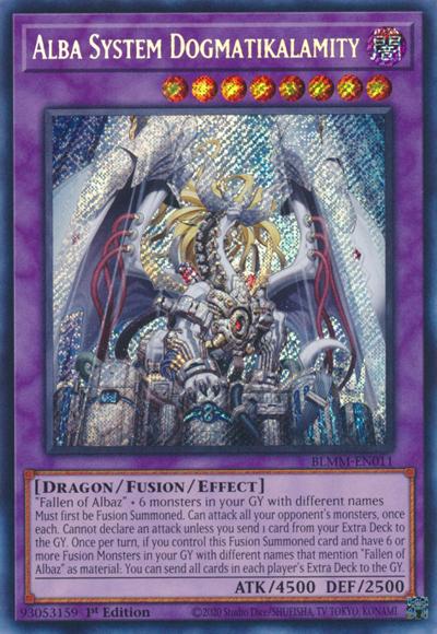 ‘Fallen of Albaz’ + 6 monsters in your GY with different names . Must first be Fusion Summoned. Can attack all your opponent’s monsters, once each. Cannot declare an attack unless you send 1 card from your Extra Deck to the GY. Once per turn, if you control this Fusion Summoned card and have 6 or more Fusion Monsters in your GY with different names that mention ‘Fallen of Albaz’ as material: You can send all cards in each player’s Extra Deck to the GY.