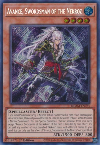 When this card is Normal Summoned: You can Special Summon 1 ‘Nekroz’ monster from your Deck, except ‘Avance, Swordsman of the Nekroz’. If you Ritual Summon exactly 1 ‘Nekroz’ Ritual Monster with a card effect that requires use of monsters, this card you control can be used as the entire Tribute. If this card is Tributed by card effect: You can add any number of your banished ‘Nekroz’ cards with different names to your hand. You can only use this effect of ‘Avance, Swordsman of the Nekroz’ once per Duel.