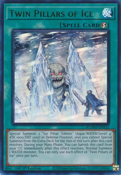 Special Summon 2 ‘Ice Pillar Tokens’ (Aqua/WATER/Level 4/ATK 1900/DEF 1200) in Defense Position, also you cannot Special Summon from the Extra Deck for the rest of this turn after this card resolves. During your Main Phase: You can banish this card from your GY; immediately after this effect resolves, Normal Summon 1 WATER monster. You can only use each effect of ‘Twin Pillars of Ice’ once per turn.