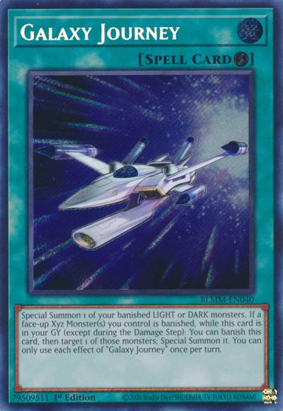 Special Summon 1 of your banished LIGHT or DARK monsters. If a face-up Xyz Monster(s) you control is banished while this card is in your GY (except during the Damage Step): You can banish this card, then target 1 of those monsters; Special Summon it. You can only use each effect of ‘Galaxy Journey’ once per turn.