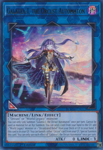 You can only Link Summon ‘Galatea-i, the Orcust Automaton(s)’ once per turn. Cannot be used as material for an Xyz Summon. You can send 1 card from your hand to the GY; add 1 ‘World Legacy’ monster or ‘Orcustrated Babel’ from your Deck or GY to your hand. If this card is in your GY: You can banish 1 other ‘Orcust’ card from your GY; Special Summon this card. You can only use each effect of ‘Galatea-i, the Orcust Automaton’ once per turn.