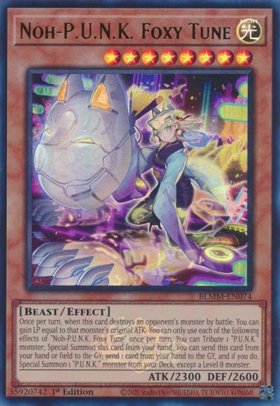 Once per turn, when this card destroys an opponent’s monster by battle: You can gain LP equal to that monster’s original ATK. You can only use each of the following effects of ‘Noh-P.U.N.K. Foxy Tune’ once per turn. You can Tribute 1 ‘P.U.N.K.’ monster; Special Summon this card from your hand. You can send this card from your hand or field to the GY; send 1 card from your hand to the GY, and if you do, Special Summon 1 ‘P.U.N.K.’ monster from your Deck, except a Level 8 monster.