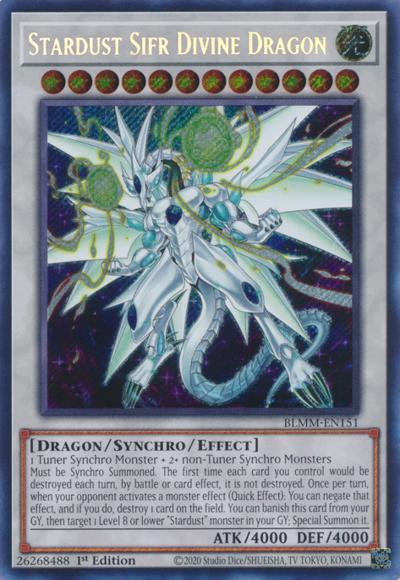 1 Tuner Synchro Monster + 2 or more non-Tuner Synchro MonstersMust be Synchro Summoned and cannot be Special Summoned by other ways. The first time each card you control would be destroyed each turn, by battle or card effect, it is not destroyed. Once per turn, during either player’s turn, when your opponent activates a monster effect: You can negate that effect, and if you do, destroy 1 card on the field. You can banish this card from your Graveyard, then target 1 Level 8 or lower ‘Stardust’ monster in your Graveyard; Special Summon it.