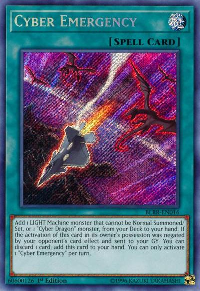 Add 1 LIGHT Machine monster that cannot be Normal Summoned/Set, or 1 ‘Cyber Dragon’ monster, from your Deck to your hand. If the activation of this card in its owner’s possession was negated by your opponent’s card effect and sent to your GY: You can discard 1 card; add this card to your hand. You can only activate 1 ‘Cyber Emergency’ per turn.