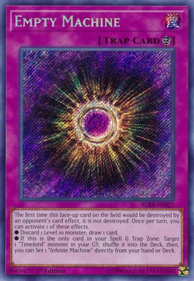 The first time this face-up card on the field would be destroyed by an opponent’s card effect, it is not destroyed. Once per turn, you can activate 1 of these effects.● Discard 1 Level 10 monster; draw 1 card.● If this is the only card in your Spell & Trap Zone: Target 1 ‘Timelord’ monster in your GY; shuffle it into the Deck, then, you can Set 1 ‘Infinite Machine’ directly from your hand or Deck.