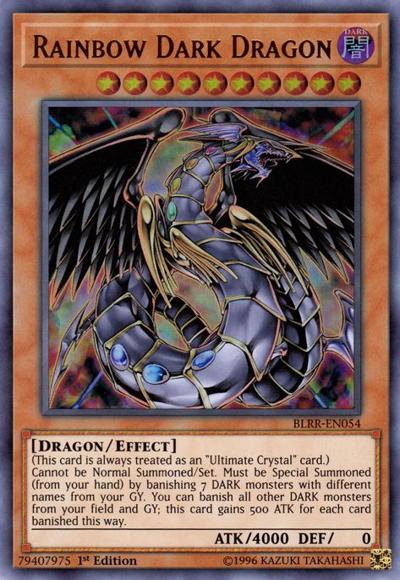(This card is always treated as an ‘Ultimate Crystal’ card.)Cannot be Normal Summoned/Set. Must be Special Summoned (from your hand) by banishing 7 DARK monsters with different names from your GY. You can banish all other DARK monsters from your field and GY; this card gains 500 ATK for each card banished this way.