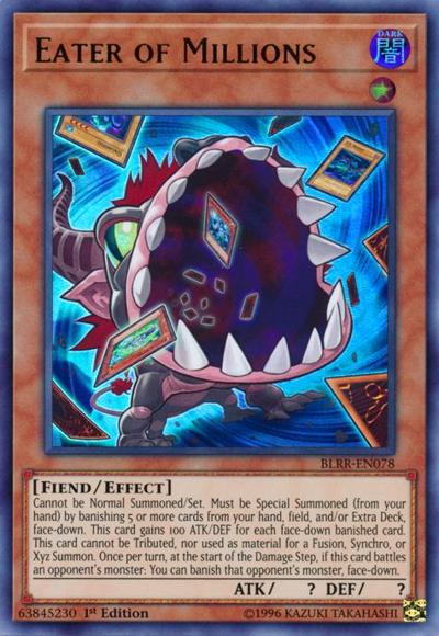 Cannot be Normal Summoned/Set. Must be Special Summoned (from your hand) by banishing 5 or more cards from your hand, field, and/or Extra Deck, face-down. This card gains 100 ATK/DEF for each face-down banished card. This card cannot be Tributed, nor used as material for a Fusion, Synchro, or Xyz Summon. Once per turn, at the start of the Damage Step, if this card battles an opponent’s monster: You can banish that opponent’s monster, face-down.