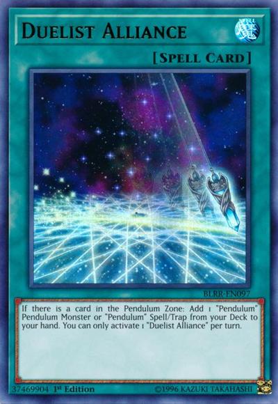 If there is a card in the Pendulum Zone: Add 1 ‘Pendulum’ Pendulum Monster or ‘Pendulum’ Spell/Trap from your Deck to your hand. You can only activate 1 ‘Duelist Alliance’ per turn.