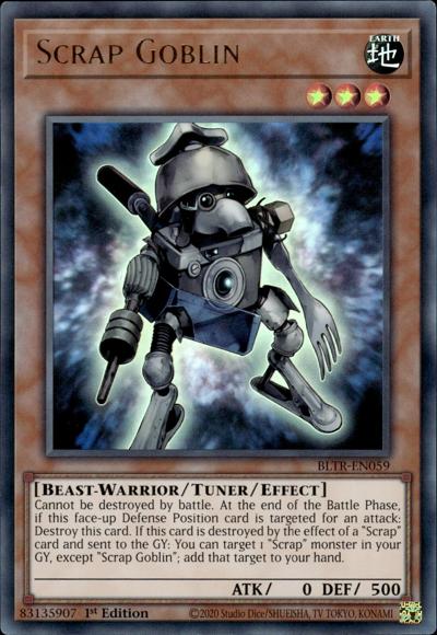 This card cannot be destroyed by battle. If this face-up Defense Position card is selected as an attack target, destroy this card at the end of the Battle Phase. If this card is destroyed by the effect of a ‘Scrap’ card and sent to the Graveyard, you can select 1 ‘Scrap’ monster in your Graveyard, except ‘Scrap Goblin’, and add it to your hand.