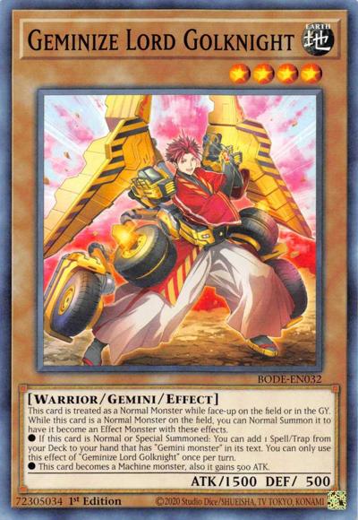This card is treated as a Normal Monster while face-up on the field or in the GY. While this card is a Normal Monster on the field, you can Normal Summon it to have it become an Effect Monster with these effects.● If this card is Normal or Special Summoned: You can add 1 Spell/Trap from your Deck to your hand that has ‘Gemini monster’ in its text. You can only use this effect of ‘Geminize Lord Golknight’ once per turn.● This card becomes a Machine monster, also it gains 500 ATK.