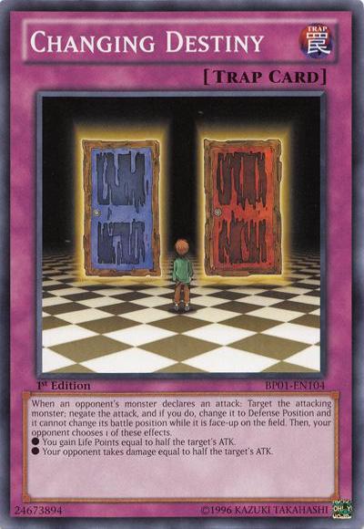 When an opponent’s monster declares an attack: Target the attacking monster; negate the attack, and if you do, change it to Defense Position and it cannot change its battle position while it is face-up on the field. Then, your opponent chooses 1 of these effects.● You (the opponent of this card’s activator) gain LP equal to half the target’s ATK.● Your opponent (the activator of this card) takes damage equal to half the target’s ATK.