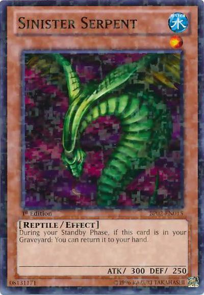 During your Standby Phase, if this card is in your GY: You can add it to your hand, also banish 1 ‘Sinister Serpent’ from your GY during your opponent’s next End Phase. You can only use this effect of ‘Sinister Serpent’ once per turn.