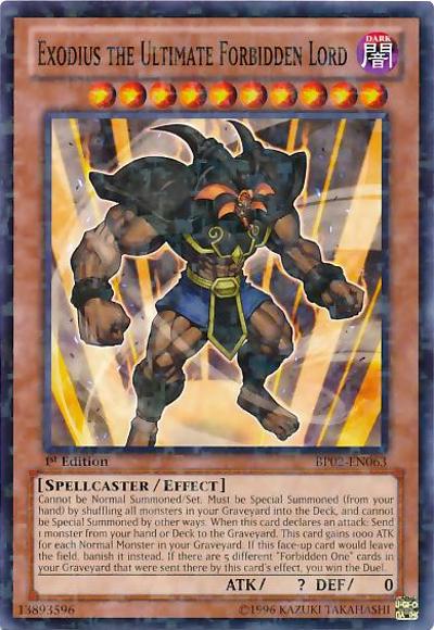 Cannot be Normal Summoned/Set. Must be Special Summoned (from your hand) by shuffling all monsters in your Graveyard into the Deck, and cannot be Special Summoned by other ways. When this card declares an attack: Send 1 monster from your hand or Deck to the Graveyard. This card gains 1000 ATK for each Normal Monster in your Graveyard. If this face-up card would leave the field, banish it instead. If there are 5 different ‘Forbidden One’ cards in your Graveyard that were sent there by this card’s effect, you win the Duel.