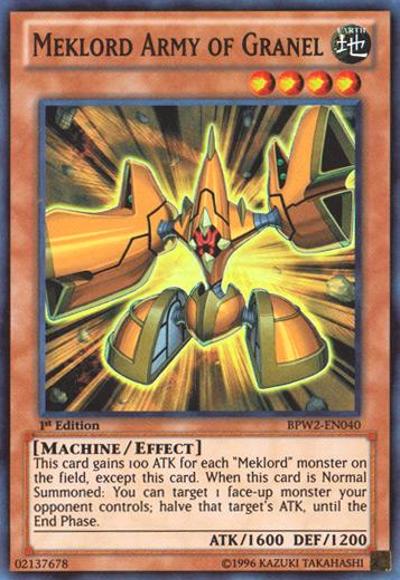 This card gains 100 ATK for each ‘Meklord’ monster on the field, except this card. When this card is Normal Summoned: You can target 1 face-up monster your opponent controls; halve that target’s ATK, until the end of this turn.