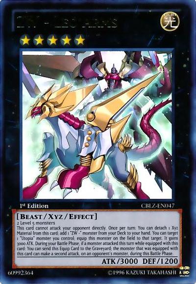 2 Level 5 monstersThis card cannot attack your opponent directly. Once per turn: You can detach 1 Xyz Material from this card; add 1 ‘ZW -‘ monster from your Deck to your hand. You can target 1 ‘Utopia’ monster you control; equip this monster on the field to that target. It gains 3000 ATK. During your Battle Phase, if a monster attacked this turn while equipped with this card: You can send this Equip Card to the Graveyard; the monster that was equipped with this card can make a second attack, on an opponent’s monster, during this Battle Phase.