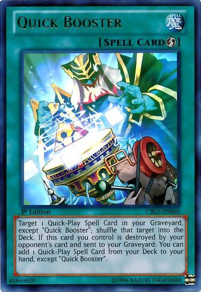 Target 1 Quick-Play Spell in your GY, except ‘Quick Booster’; shuffle that target into the Deck. If this card you control is destroyed by your opponent’s card and sent to your GY: You can add 1 Quick-Play Spell from your Deck to your hand, except ‘Quick Booster’.
