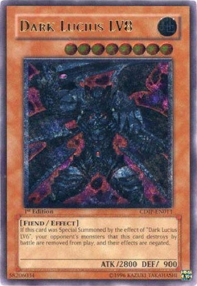 If this card was Special Summoned by the effect of ‘Dark Lucius LV6’, your opponent’s monsters that this card destroys by battle are removed from play, and their effects are negated.