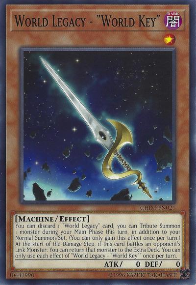 You can discard 1 ‘World Legacy’ card; you can Tribute Summon 1 monster during your Main Phase this turn, in addition to your Normal Summon/Set. (You can only gain this effect once per turn.) At the start of the Damage Step, if this card battles an opponent’s Link Monster: You can return that monster to the Extra Deck. You can only use each effect of ‘World Legacy – ‘World Key” once per turn.