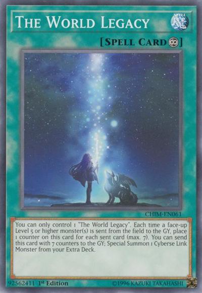 You can only control 1 ‘The World Legacy’. Each time a face-up Level 5 or higher monster(s) is sent from the field to the GY, place 1 counter on this card for each sent card (max. 7). You can send this card with 7 counters to the GY; Special Summon 1 Cyberse Link Monster from your Extra Deck.