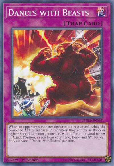 When an opponent’s monster declares a direct attack, while the combined ATK of all face-up monsters they control is 8000 or higher: Special Summon 3 monsters with different original names in Attack Position, 1 each from your hand, Deck, and GY. You can only activate 1 ‘Dances with Beasts’ per turn.