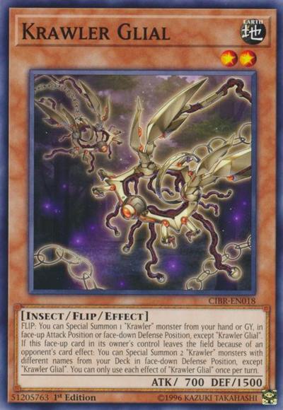 FLIP: You can Special Summon 1 ‘Krawler’ monster from your hand or GY, in face-up Attack Position or face-down Defense Position, except ‘Krawler Glial’.If this face-up card in its owner’s control leaves the field because of an opponent’s card effect: You can Special Summon 2 ‘Krawler’ monsters with different names from your Deck in face-down Defense Position, except ‘Krawler Glial’. You can only use each effect of ‘Krawler Glial’ once per turn.