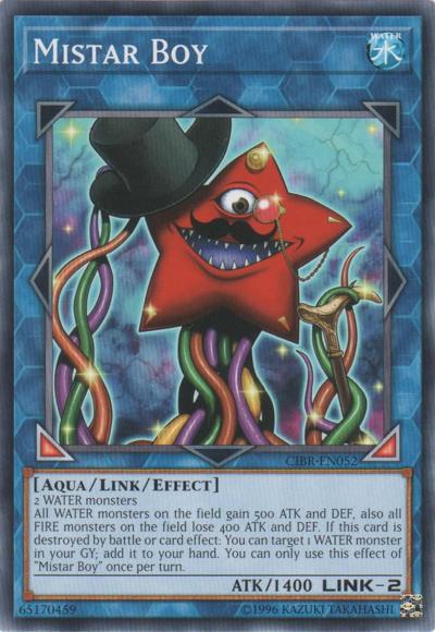 2 WATER monstersAll WATER monsters on the field gain 500 ATK and DEF, also all FIRE monsters on the field lose 400 ATK and DEF. If this card is destroyed by battle or card effect: You can target 1 WATER monster in your GY; add it to your hand. You can only use this effect of ‘Mistar Boy’ once per turn.