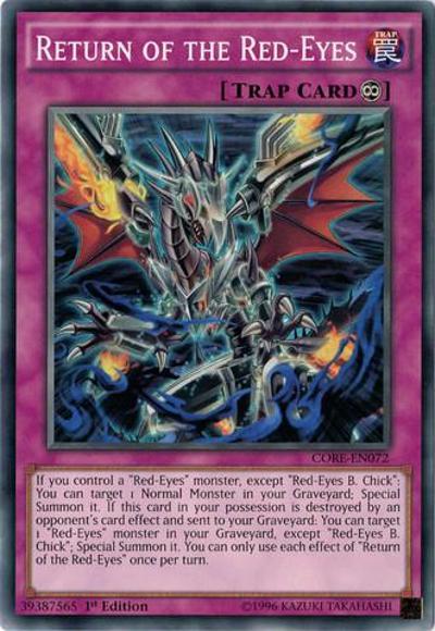 If you control a ‘Red-Eyes’ monster, except ‘Red-Eyes B. Chick’: You can target 1 Normal Monster in your Graveyard; Special Summon it. If this card in your possession is destroyed by an opponent’s card effect and sent to your Graveyard: You can target 1 ‘Red-Eyes’ monster in your Graveyard, except ‘Red-Eyes B. Chick’; Special Summon it. You can only use each effect of ‘Return of the Red-Eyes’ once per turn.