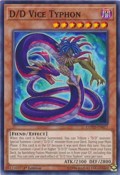 When this card is Normal Summoned: You can Tribute 1 ‘D/D’ monster; Special Summon 1 Level 7 ‘D/D/D’ monster from your Deck. During your Main Phase, if this card is in the GY because it was sent there this turn: You can Fusion Summon 1 Level 8 or higher ‘D/D/D’ Fusion Monster from your Extra Deck, by banishing Fusion Materials listed on it from your GY, including this card. You can only use each effect of ‘D/D Vice Typhon’ once per turn.