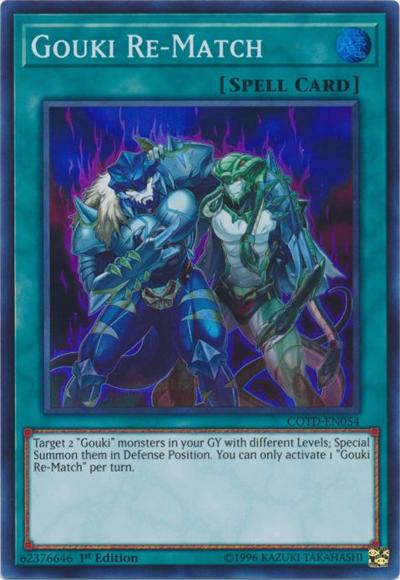 Target 2 ‘Gouki’ monsters in your GY with different Levels; Special Summon them in Defense Position. You can only activate 1 ‘Gouki Re-Match’ per turn.