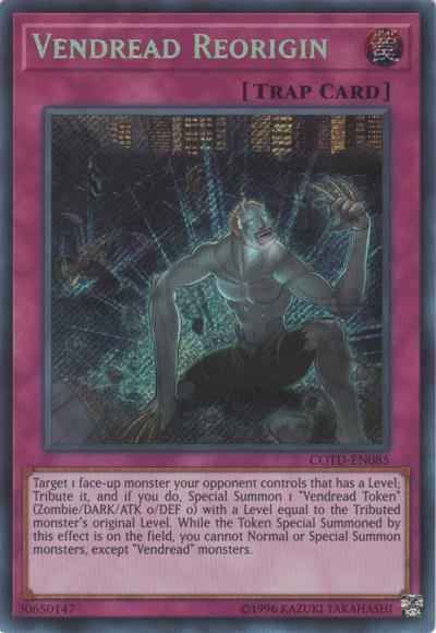 Target 1 face-up monster your opponent controls that has a Level; Tribute it, and if you do, Special Summon 1 ‘Vendread Token’ (Zombie/DARK/ATK 0/DEF 0) with a Level equal to the Tributed monster’s original Level. While the Token Special Summoned by this effect is on the field, you cannot Normal or Special Summon monsters, except ‘Vendread’ monsters.