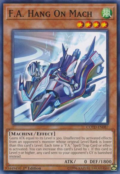 Gains ATK equal to its Level x 300. Unaffected by activated effects from an opponent’s monster whose original Level/Rank is lower than this card’s Level. Each time a ‘F.A.’ Spell/Trap Card or effect is activated: You can increase this card’s Level by 1. If this card is Level 7 or higher, any card sent to your opponent’s GY is banished instead.