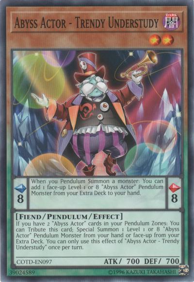 Pendulum EffectWhen you Pendulum Summon a monster: You can add 1 face-up Level 1 or 8 ‘Abyss Actor’ Pendulum Monster from your Extra Deck to your hand.Monster EffectIf you have 2 ‘Abyss Actor’ cards in your Pendulum Zones: You can Tribute this card; Special Summon 1 Level 1 or 8 ‘Abyss Actor’ Pendulum Monster from your hand or face-up from your Extra Deck. You can only use this effect of ‘Abyss Actor – Trendy Understudy’ once per turn.