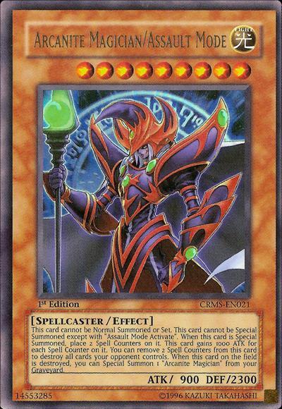 This card cannot be Normal Summoned or Set. This card cannot be Special Summoned except with ‘Assault Mode Activate’. When this card is Special Summoned, place 2 Spell Counters on it. This card gains 1000 ATK for each Spell Counter on it. You can remove 2 Spell Counters from this card to destroy all cards your opponent controls. When this card on the field is destroyed, you can Special Summon 1 ‘Arcanite Magician’ from your Graveyard.