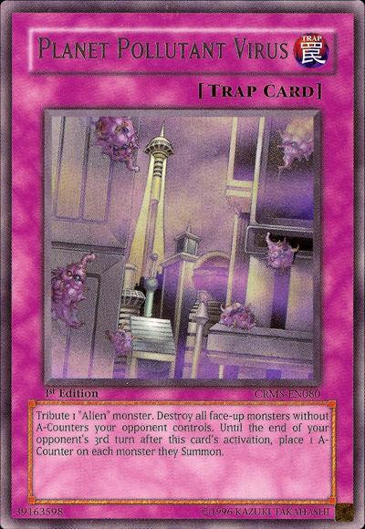 Tribute 1 ‘Alien’ monster. Destroy all face-up monsters without A-Counters your opponent controls. Until the end of your opponent’s 3rd turn after this card’s activation, place 1 A-Counter on each monster they Summon.