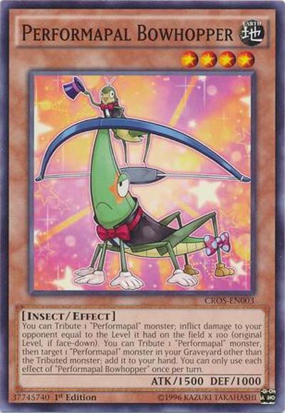 You can Tribute 1 ‘Performapal’ monster; inflict damage to your opponent equal to the Level it had on the field x 100 (original Level, if face-down). You can Tribute 1 ‘Performapal’ monster, then target 1 ‘Performapal’ monster in your Graveyard other than the Tributed monster; add it to your hand. You can only use each effect of ‘Performapal Bowhopper’ once per turn.