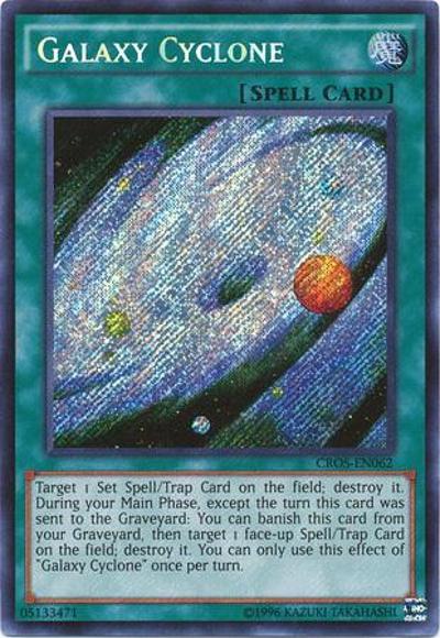 Target 1 Set Spell/Trap Card on the field; destroy it. During your Main Phase, except the turn this card was sent to the Graveyard: You can banish this card from your Graveyard, then target 1 face-up Spell/Trap Card on the field; destroy it. You can only use this effect of ‘Galaxy Cyclone’ once per turn.