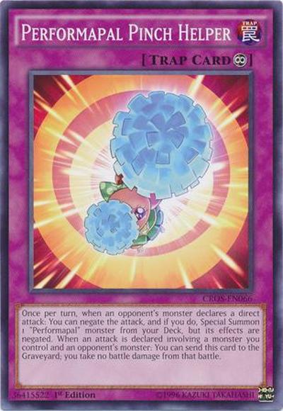 Once per turn, when an opponent’s monster declares a direct attack: You can negate the attack, and if you do, Special Summon 1 ‘Performapal’ monster from your Deck, but its effects are negated. When an attack is declared involving a monster you control and an opponent’s monster: You can send this card to the Graveyard; you take no battle damage from that battle.