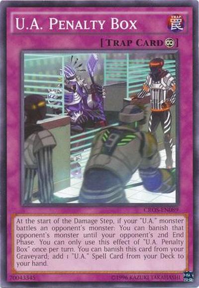 At the start of the Damage Step, if your ‘U.A.’ monster battles an opponent’s monster: You can banish that opponent’s monster until your opponent’s 2nd End Phase. You can only use this effect of ‘U.A. Penalty Box’ once per turn. You can banish this card from your Graveyard; add 1 ‘U.A.’ Spell Card from your Deck to your hand.