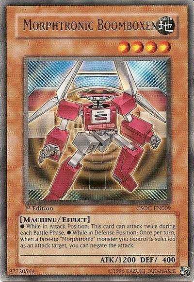● While in Attack Position, this card can attack twice during each Battle Phase.● Once per turn, while in Defense Position, when a face-up ‘Morphtronic’ monster you control is targeted for an attack: You can negate the attack.