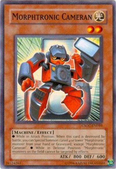 ● While in Attack Position: When this card is destroyed by battle, you can Special Summon 1 Level 4 or lower ‘Morphtronic’ monster from your hand or Graveyard, except ‘Morphtronic Cameran’. ● While in Defense Position: ‘Morphtronic’ monsters on the field cannot be targeted by effects.