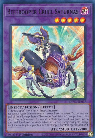 1 ‘Beetrooper’ monster + 1 Insect monsterYou cannot Special Summon monsters, except Insect monsters. You can only use each of the following effects of ‘Beetrooper Cruel Saturnas’ once per turn. If this card is Special Summoned: You can add 1 ‘Beetrooper’ card from your Deck to your hand. If an Insect monster(s) is banished face-up (except during the Damage Step): You can target 1 of your banished ‘Beetrooper’ monsters; Special Summon it.