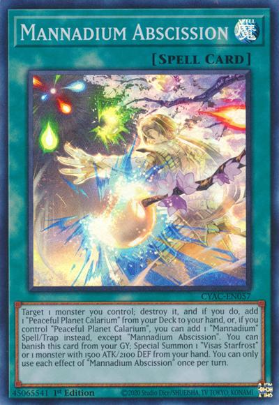 Target 1 monster you control; destroy it, and if you do, add 1 ‘Peaceful Planet Calarium’ from your Deck to your hand, or, if you control ‘Peaceful Planet Calarium’, you can add 1 ‘Mannadium’ Spell/Trap instead, except ‘Mannadium Abscission’. You can banish this card from your GY; Special Summon 1 ‘Visas Starfrost’ or 1 monster with 1500 ATK/2100 DEF from your hand. You can only use each effect of ‘Mannadium Abscission’ once per turn.