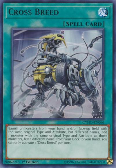Banish 2 monsters from your hand and/or face-up field with the same original Type and Attribute, but different names; add 1 monster with the same original Type and Attribute as those monsters, but a different name, from your Deck to your hand. You can only activate 1 ‘Cross Breed’ per turn.