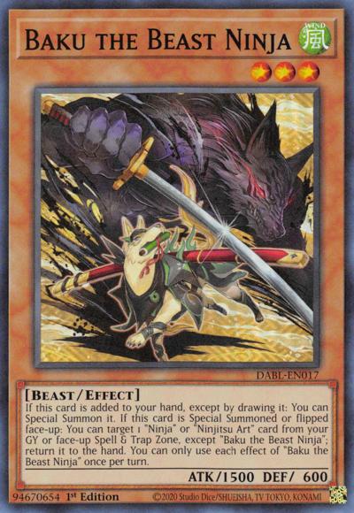 If this card is added to your hand, except by drawing it: You can Special Summon it. If this card is Special Summoned or flipped face-up: You can target 1 ‘Ninja’ or ‘Ninjitsu Art’ card from your GY or face-up Spell & Trap Zone, except ‘Baku the Beast Ninja’; return it to the hand. You can only use each effect of ‘Baku the Beast Ninja’ once per turn.