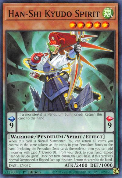 Pendulum EffectIf a monster(s) is Pendulum Summoned: Return this card to the hand.Monster EffectWhen this card is Normal Summoned: You can return all cards you control in the same column as the cards in your Pendulum Zones to the hand (including the Pendulum Zone cards themselves), then you can add 1 monster with 2400 ATK/1000 DEF from your Deck to your hand, except ‘Han-Shi Kyudo Spirit’. Once per turn, during the End Phase, if this card was Normal Summoned or flipped face-up this turn: Return this card to the hand.